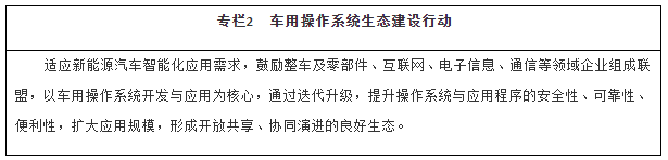 第二节 促进关键系统创新应用 加快车用操作系统开发应用。以整车企业需求为牵引,发挥龙头企业、国家制造业创新中心等创新平台作用,坚持软硬协同攻关,集中开发车用操作系统。围绕车用操作系统,构建整车、关键零部件、基础数据与软件等领域市场主体深度合作的开发与应用生态。通过产品快速迭代,扩大用户规模,加快车用操作系统产业化应用。