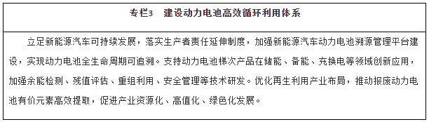推动动力电池全价值链发展。鼓励企业提高锂、镍、钴、铂等关键资源保障能力。建立健全动力电池模块化标准体系,加快突破关键制造装备,提高工艺水平和生产效率。完善动力电池回收、梯级利用和再资源化的循环利用体系,鼓励共建共用回收渠道。建立健全动力电池运输仓储、维修保养、安全检验、退役退出、回收利用等环节管理制度,加强全生命周期监管。