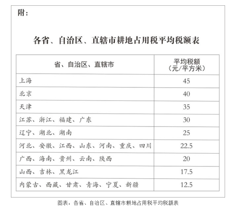 各地区耕地占用税的适用税额,由省、自治区、直辖市人民政府根据人均耕地面积和经济发展等情况,在前款规定的税额幅度内提出,报同级人民代表大会常务委员会决定,并报全国人民代表大会常务委员会和国务院备案。各省、自治区、直辖市耕地占用税适用税额的平均水平,不得低于本法所附《各省、自治区、直辖市耕地占用税平均税额表》规定的平均税额。